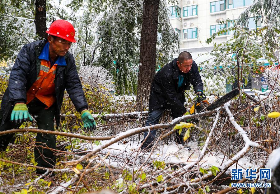 10月18日,工作人員在烏魯木齊清理被積雪壓斷的樹木。當(dāng)日,新疆烏魯木齊迎來(lái)一場(chǎng)降雪。 新華社記者 江文耀 攝