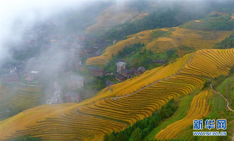 這是10月16日無人機拍攝的龍脊梯田秋色。金秋時節(jié),廣西龍勝各族自治縣龍脊梯田美如畫卷。 新華社記者 黃孝邦 攝