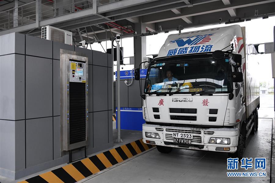 這是貨運車輛在進(jìn)行模擬通關(guān)(10月17日攝)。 新華社記者 梁旭 攝