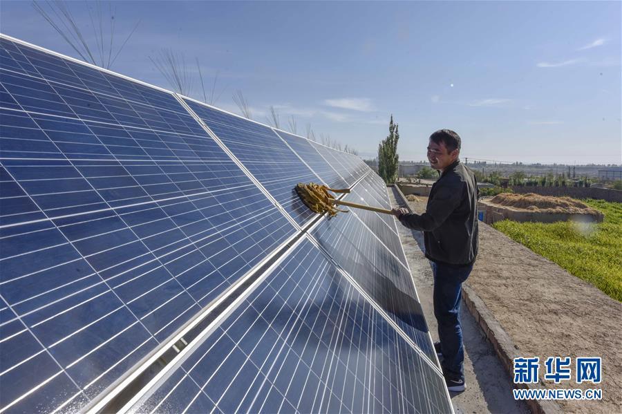 在新疆哈密市伊州區(qū)回城鄉(xiāng)鐵木爾提村,村民潘林琪打掃自家房頂上的太陽能發(fā)電板(2018年9月21日攝)。今年以來,新疆穩(wěn)步推進(jìn)新能源參與“疆電外送”、擴(kuò)大與燃煤自備電廠調(diào)峰替代交易等多種電力交易方式,著力破解“綠色電力”上網(wǎng)難題,新能源發(fā)電量同比增加近13個百分點,而棄電量和棄電比實現(xiàn)“雙降”,綠色發(fā)展理念進(jìn)一步落實。新疆是我國重要的能源供應(yīng)和儲備基地,風(fēng)能、太陽能儲量豐富。近年來,新疆新能源裝機(jī)總量突破2700萬千瓦,規(guī)模和占比均居全國前列。新華社記者 趙戈 攝