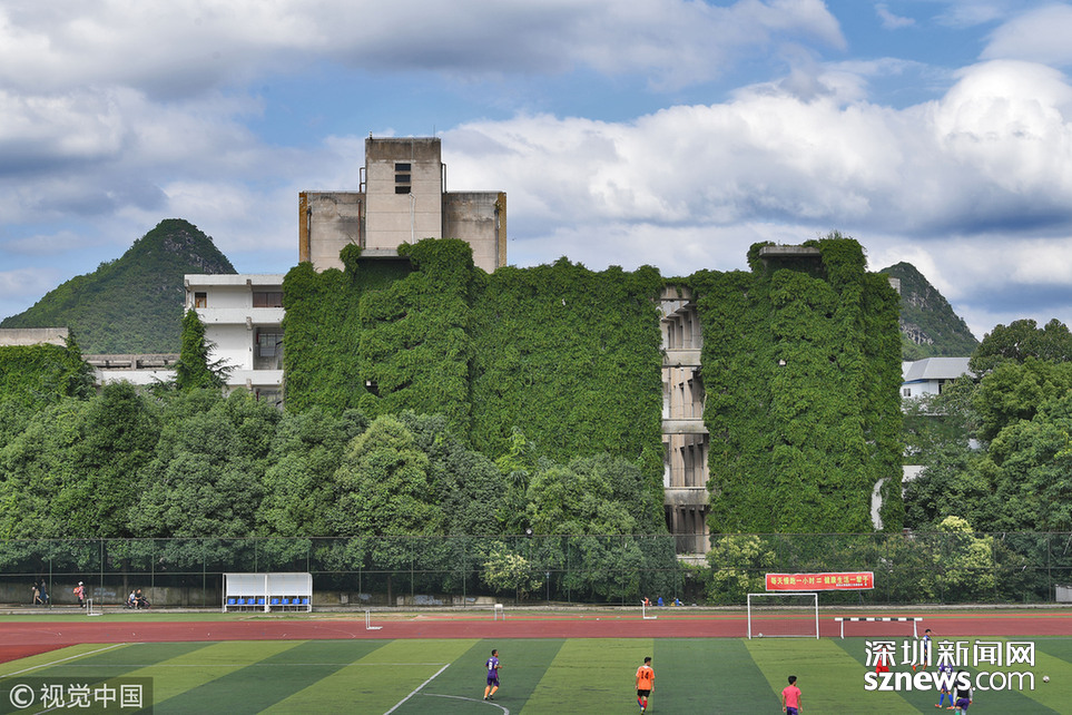 2018年6月20日,貴陽(yáng),貴州大學(xué)現(xiàn)12層樓近50米高綠色“巨瀑”。據(jù)悉,這是該校的老師們?cè)?6年前栽種的300多棵爬山虎,如今爬滿12層高的圖書(shū)館大樓,猶如“綠色城堡”。