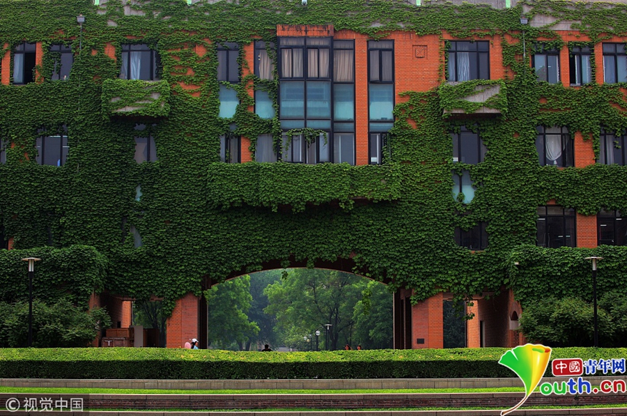 2018年5月10日,北京。在清華校園內(nèi)教學(xué)樓、辦公樓等多處建筑物上被爬山虎攀爬扮綠,呈現(xiàn)一派綠裝素裹自然美麗景觀。