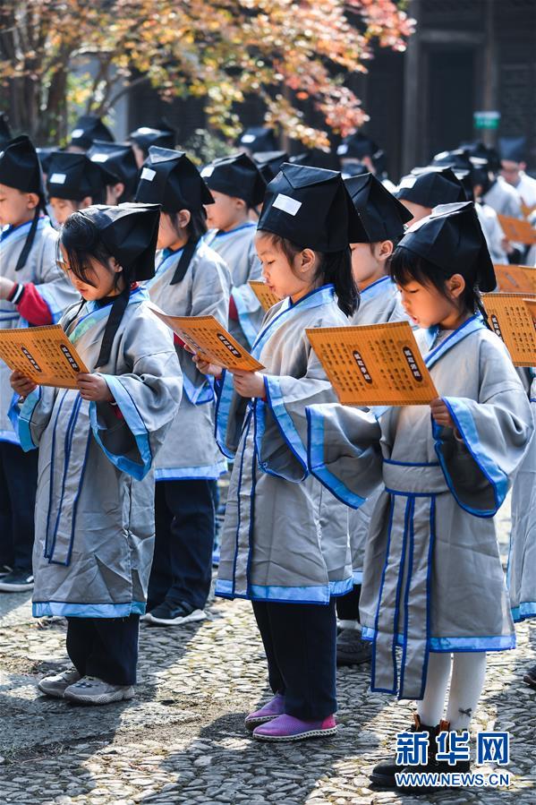10月23日,學(xué)生們?cè)谡b讀國(guó)學(xué)經(jīng)典。當(dāng)日,浙江省長(zhǎng)興縣第八小學(xué)舉行“誦家規(guī)家訓(xùn),傳中華美德”校園“誠(chéng)敬日”主題教育活動(dòng),通過誦讀國(guó)學(xué)經(jīng)典、講勵(lì)志故事、演美德戲劇等形式,讓學(xué)生感受優(yōu)秀傳統(tǒng)文化。近年來(lái),該學(xué)校立足“誠(chéng)敬”文化,注重國(guó)學(xué)啟蒙教育,讓學(xué)生從小培養(yǎng)“以誠(chéng)立身、以敬處事”的良好品質(zhì)。新華社記者 徐昱 攝