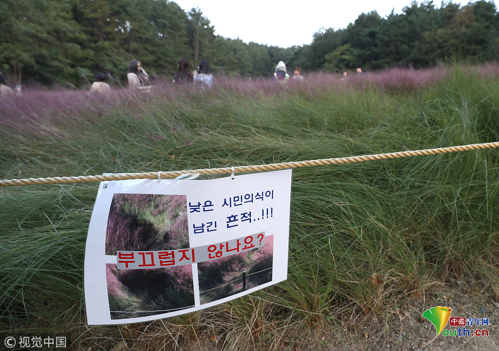 韓國(guó)蔚山,近日,蔚山公園大片粉黛亂子草盛開(kāi),但部分花海遭游客隨意踩踏。公園并沒(méi)有修復(fù)遭破壞區(qū)域,而是用繩索圍起并掛上批判性告示,呼吁游客腳下留情。圖片作者:Yonhap News Agency