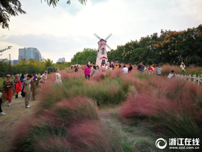 游客在生態(tài)樂(lè)園粉黛亂子草和風(fēng)車(chē)前留影。