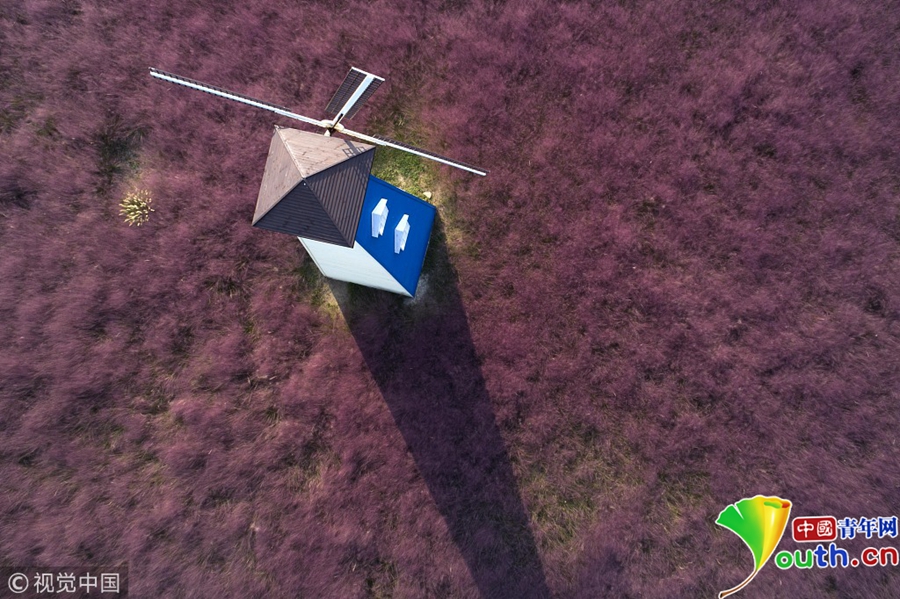 游客在生態(tài)樂(lè)園粉黛亂子草中的風(fēng)車(chē)。