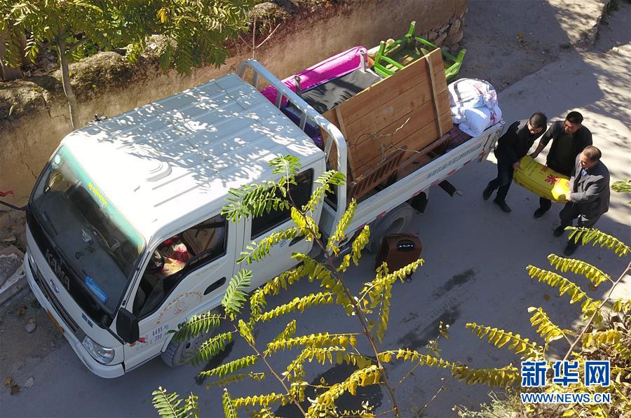 在隴南市武都區(qū)坪埡藏族鄉(xiāng)舊墩村,村民將物品裝車(chē)準(zhǔn)備搬遷下山(10月31日無(wú)人機(jī)拍攝)。 新華社記者 范培珅攝