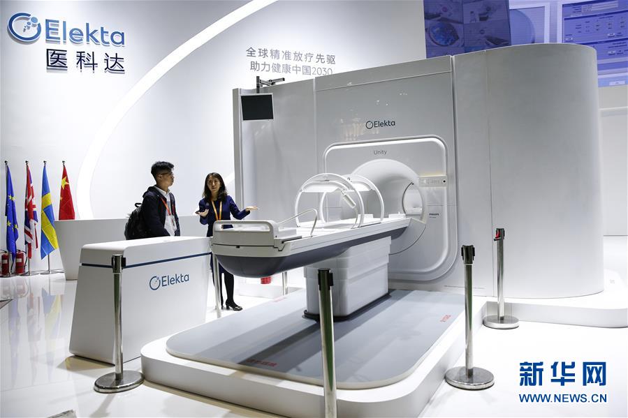 11月6日,瑞典醫(yī)科達公司工作人員為一名記者介紹高場強磁共振放療系統(tǒng)Elekta Unity。該款診斷級磁共振成像系統(tǒng)與先進的放療加速器有機結(jié)合,可以在腫瘤放療治療的過程中實時、高分辨率地顯示和追蹤腫瘤的變化。 新華社記者 張玉薇 攝