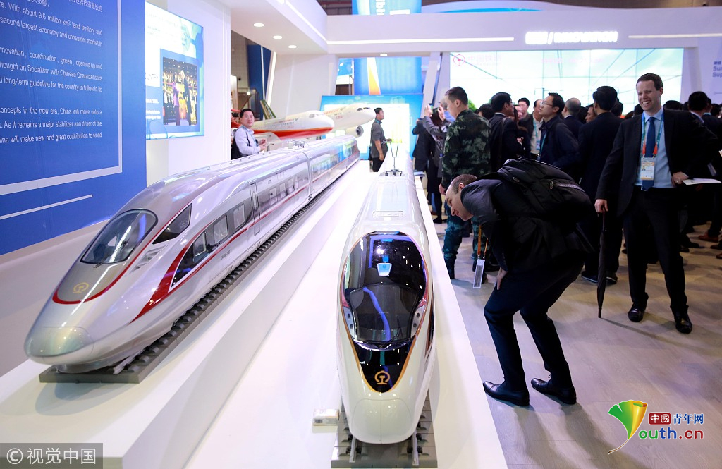 2018年11月6日,上海,首屆中國(guó)國(guó)際進(jìn)口博覽會(huì)國(guó)家展上,共有82個(gè)國(guó)家、3個(gè)國(guó)際組織設(shè)立了71個(gè)展臺(tái)。中國(guó)館展示的復(fù)興號(hào)。視覺中國(guó)