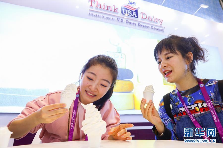 11月7日,兩位參觀者在進(jìn)博會(huì)食品及農(nóng)產(chǎn)品展區(qū)美國(guó)乳品出口協(xié)會(huì)展臺(tái)品嘗冰激凌。 新華社記者 劉大偉 攝