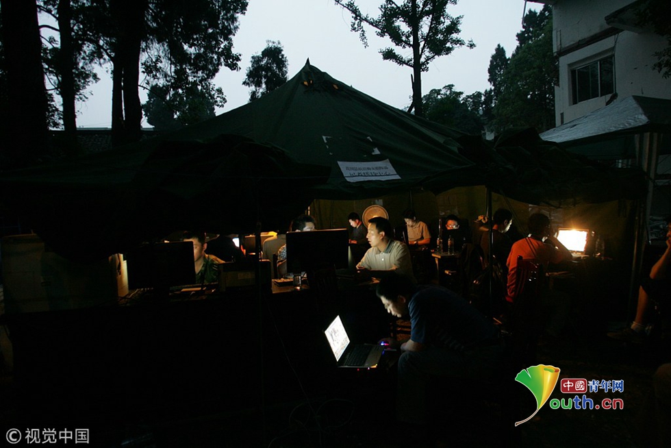 2008年5月17日晚。青川縣委宣傳部在機(jī)關(guān)大院倒塌的廢墟上,為從各地趕來的記者設(shè)立了帳篷發(fā)稿中心,此前由于通訊中斷與外界失去聯(lián)系,比起其它災(zāi)區(qū)被媒體關(guān)注晚了三天,被譽(yù)為“最后發(fā)現(xiàn)的重災(zāi)區(qū)”。圖片作者:李杰/視覺中國