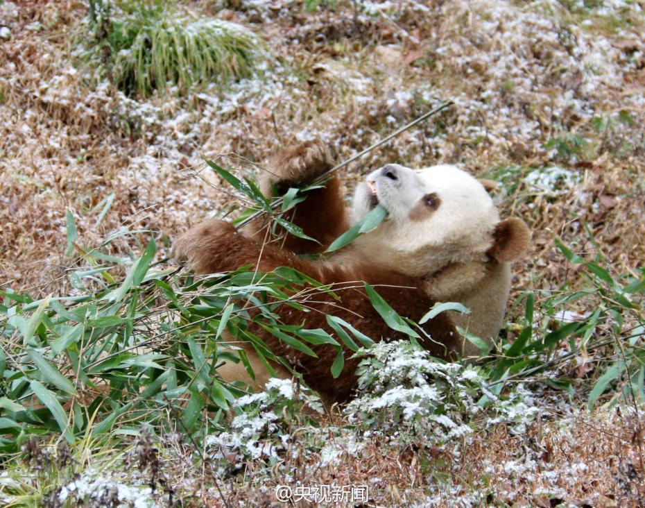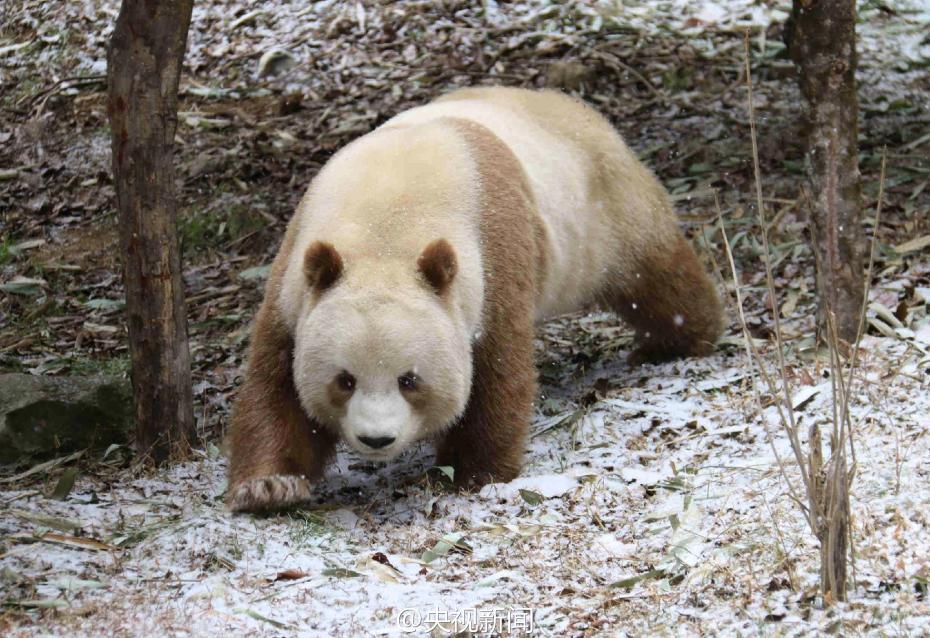 秦嶺大熊貓野化培訓佛坪基地,7歲的棕色大熊貓七仔是目前全世界唯一能看到的棕色大熊貓活體。今年是它在基地過的第二個冬天,每逢下雪,七仔就興奮地滿園子跑,變身“雪花熊”。圖片來源:央視新聞官方微博