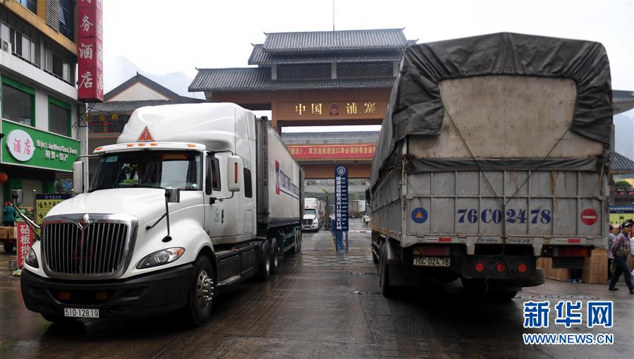 在廣西憑祥市浦寨邊貿(mào)區(qū),東盟國(guó)家的貨車進(jìn)出運(yùn)貨(1月16日攝)。新華社記者 張愛林 攝