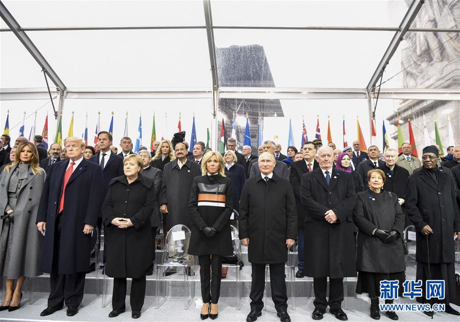 11月11日,在法國(guó)巴黎,俄羅斯總統(tǒng)普京(前右四)、德國(guó)總理默克爾(前左三)與美國(guó)總統(tǒng)特朗普(前左二)出席紀(jì)念儀式。當(dāng)日,法國(guó)政府在巴黎凱旋門前舉行儀式,隆重紀(jì)念第一次世界大戰(zhàn)結(jié)束一百周年。新華社記者 陳益宸 攝