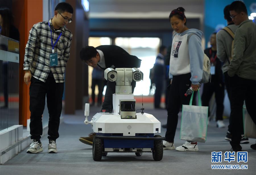 11月10日,人們在展會現(xiàn)場觀看展出的一款電力巡檢機器人。