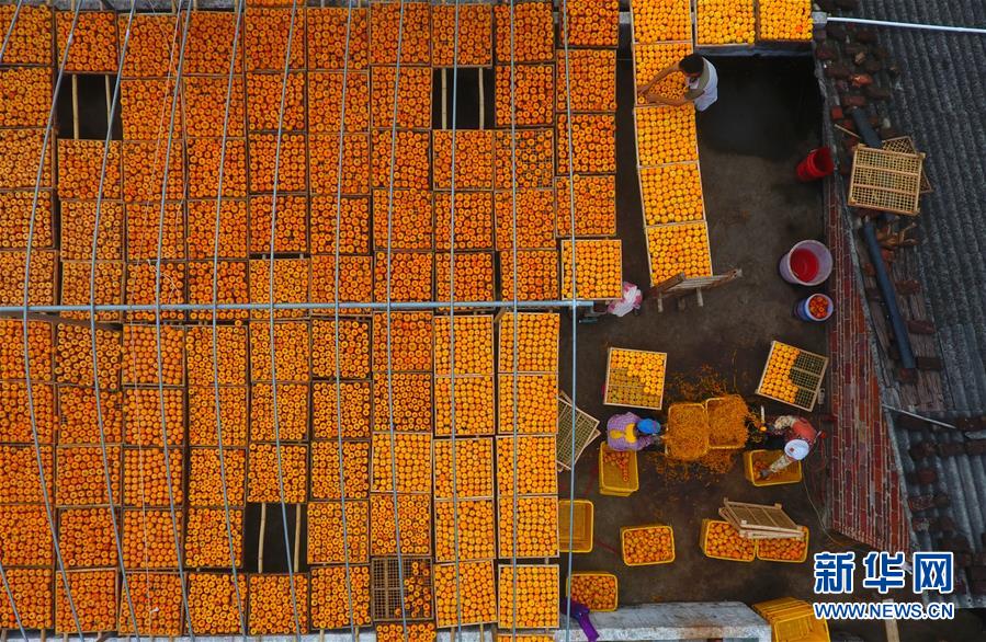 10月17日,廣西桂林市平樂縣沙子鎮(zhèn)渡河村農(nóng)民在晾曬柿子(無人機拍攝)。 金秋時節(jié),農(nóng)民們忙著收獲成熟的農(nóng)作物,喜迎豐收。 新華社記者 黃孝邦 攝