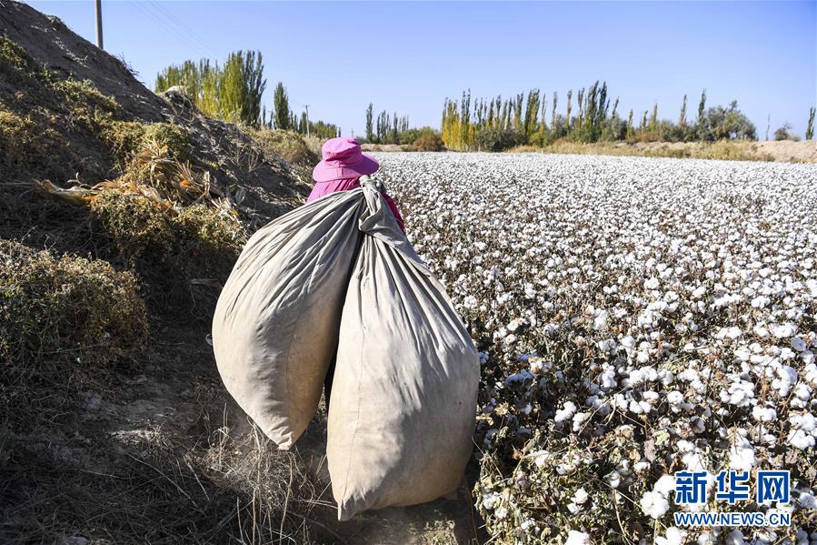 在新疆巴楚縣多來提巴格鄉(xiāng)卡扎尼塔皮提村,陳喜波背著兩袋棉花行走在棉田里(10月24日攝)。