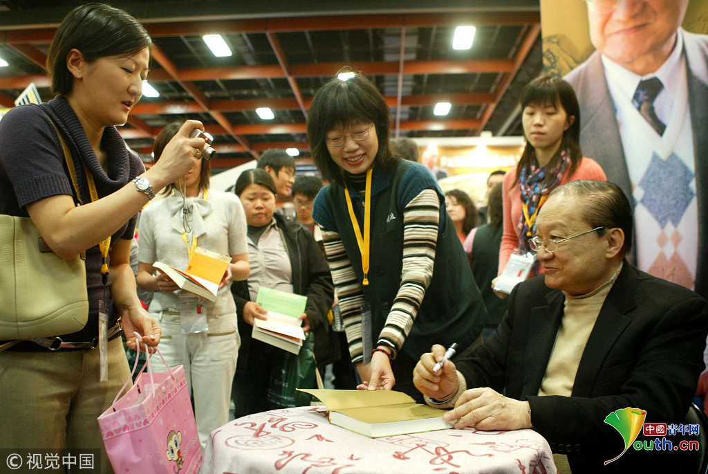 2007年2月2日上午,臺(tái)灣,武俠小說(shuō)大師金庸現(xiàn)身臺(tái)北國(guó)際書(shū)展為書(shū)迷簽名,許多讀者除了拿小說(shuō)來(lái)簽名外,還帶著相機(jī)來(lái)拍照。圖片作者:聯(lián)合知識(shí)庫(kù)