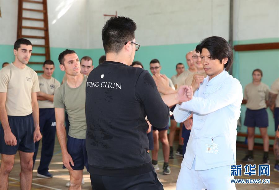 11月13日,在馬耳他首都瓦萊塔,鄭祖杰(前右)向馬耳他士兵展示詠春拳。 當(dāng)日,中國國家級非物質(zhì)文化遺產(chǎn)詠春拳代表性傳承人鄭祖杰走進(jìn)馬耳他武裝部隊,向官兵展示詠春拳。這一活動是馬耳他中國文化中心與馬耳他武術(shù)協(xié)會合辦的詠春拳系列展示活動之一。 新華社記者 袁韻 攝