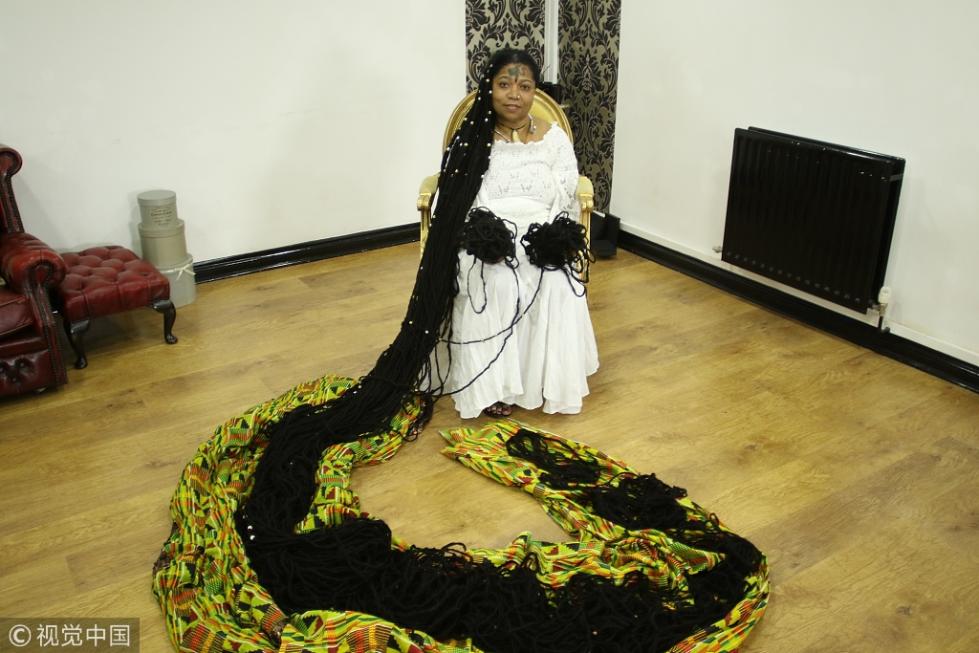 她的頭發(fā)現(xiàn)在長約34米(110英尺),超過三輛雙層巴士的長度。Asha Mandela十年前打破了世界吉尼斯頭發(fā)最長的記錄。