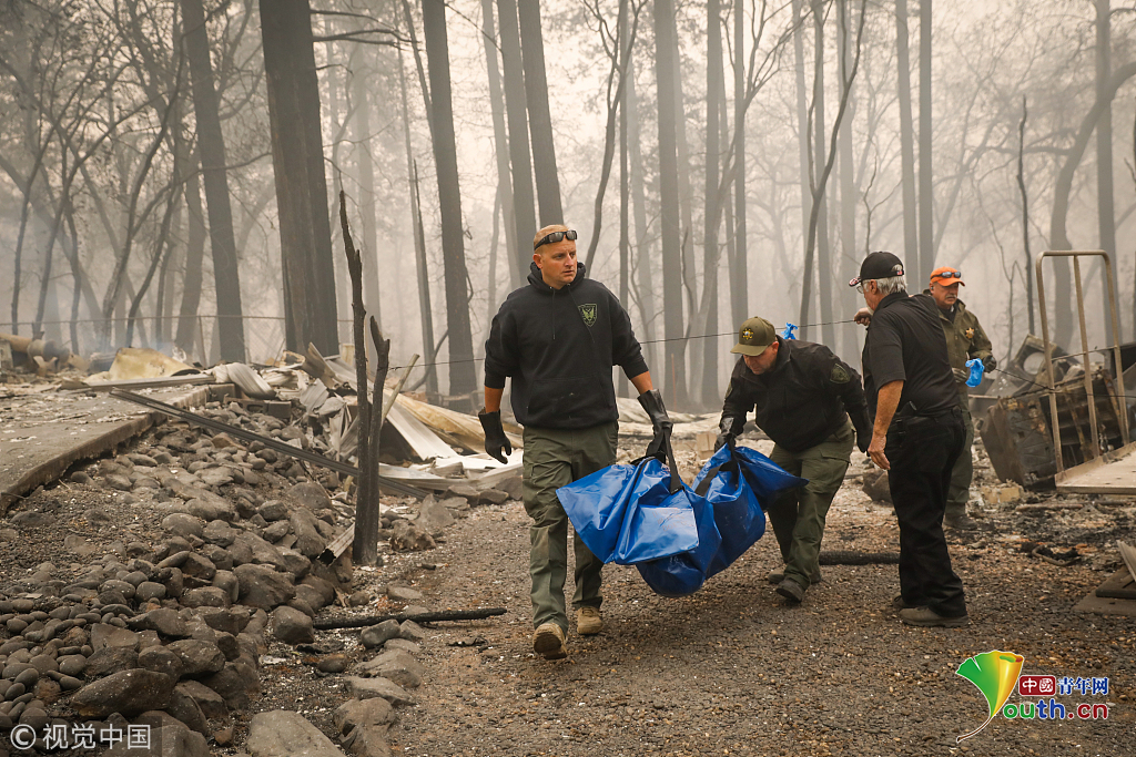 當?shù)貢r間2018年11月10日至11月11日,美國加州Paradise,當?shù)厣交鹚僚?,治安官們在災區(qū)搜尋遇難者遺體。圖片作者:Gabrielle Lurie