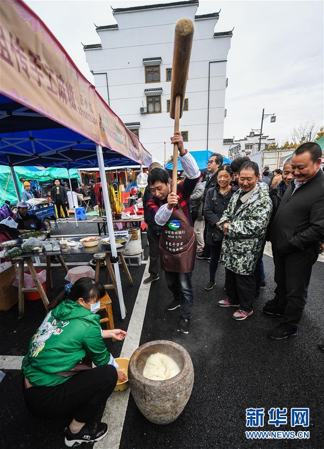 11月19日,商戶在廟會現場展示傳統(tǒng)打年糕。 新華社記者 徐昱 攝