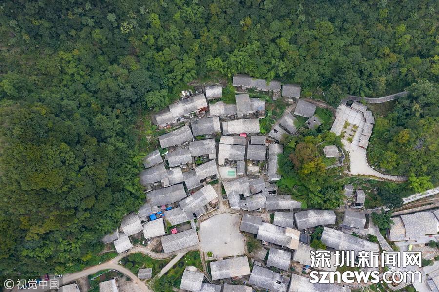 深圳新聞網訊 2018年9月27日,貴州安順,航拍坐落在群山中的鎮(zhèn)寧布依族苗族自治縣高蕩村。鎮(zhèn)寧高蕩村民居為石木結構干欄式石板房,建造時間五、六十年至數百年不等,建筑保存基本完好。