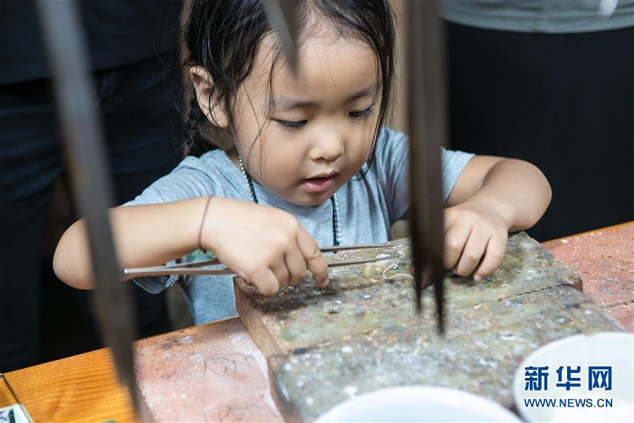 8月3日,來自西安的小朋友月白在龍?zhí)栥y飾體驗(yàn)工作室中學(xué)習(xí)制作銀飾。