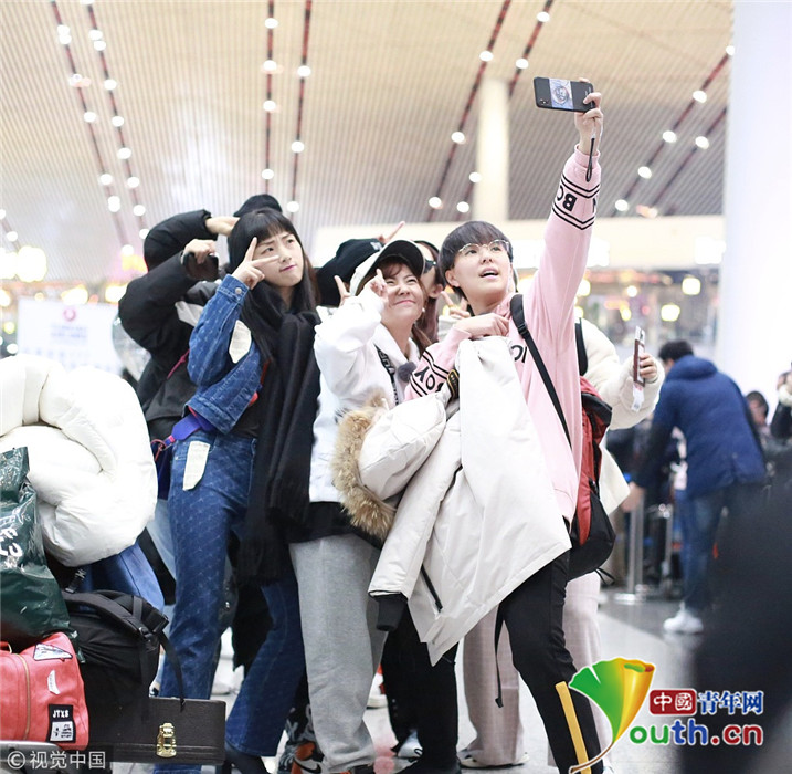 2018年12月3日,北京,“火箭少女101”全體成員現(xiàn)身機(jī)場(chǎng)前往國(guó)外錄制團(tuán)總綜。其中孟美岐戴著墨鏡,一身全黑運(yùn)動(dòng)裝扮,大步流星氣場(chǎng)超強(qiáng),楊蕓晴、yamy、楊超越等成員緊隨其后,大家還一起在機(jī)場(chǎng)玩起自拍,好不歡樂。