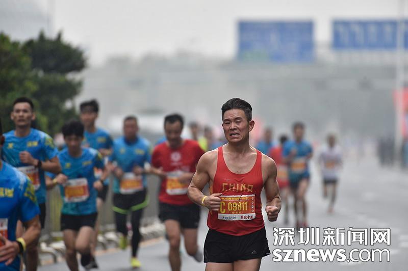 2018年12月16日,深圳國(guó)際馬拉松位于后海的折返點(diǎn),一名身著中國(guó)字樣背心的選手正向終點(diǎn)沖刺。