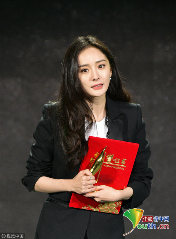 楊冪上臺(tái)領(lǐng)獎(jiǎng)西裝精致干練 談話間舉手顯呆萌