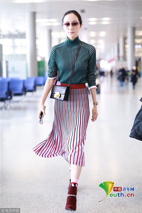 2019年1月17日,上海,韓雪現(xiàn)身機(jī)場(chǎng),穿著條紋紗裙露出小腿,十分抗凍,她搭配經(jīng)典的駝色大衣,氣質(zhì)出眾在機(jī)場(chǎng)人群中相當(dāng)搶鏡。