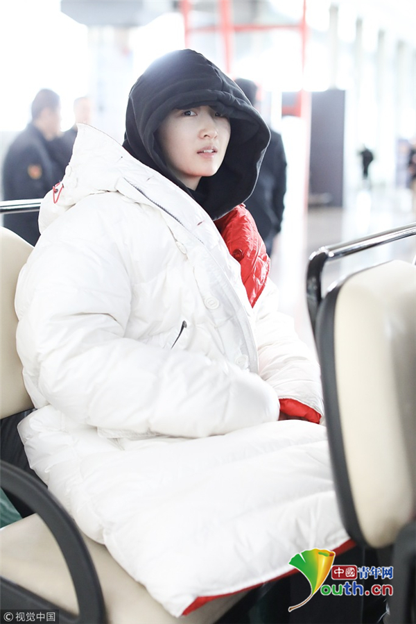 周冬雨連衣帽罩頭襯托小臉 下巴擱在行李車推桿呆萌可愛(ài)
