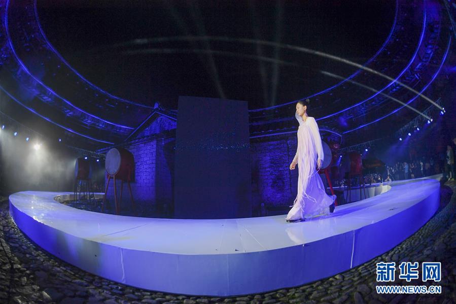 4月27日,模特在位于福建省南靖縣的土樓裕昌樓展示服飾。 當(dāng)日,土樓光語國際時尚大秀在福建省南靖縣的土樓裕昌樓內(nèi)舉行。這場融匯文化、時尚與旅游元素的大秀,通過傳統(tǒng)與時尚的有機融合,展現(xiàn)南靖土樓及文化的魅力和風(fēng)采。 新華社記者 宋為偉 攝
