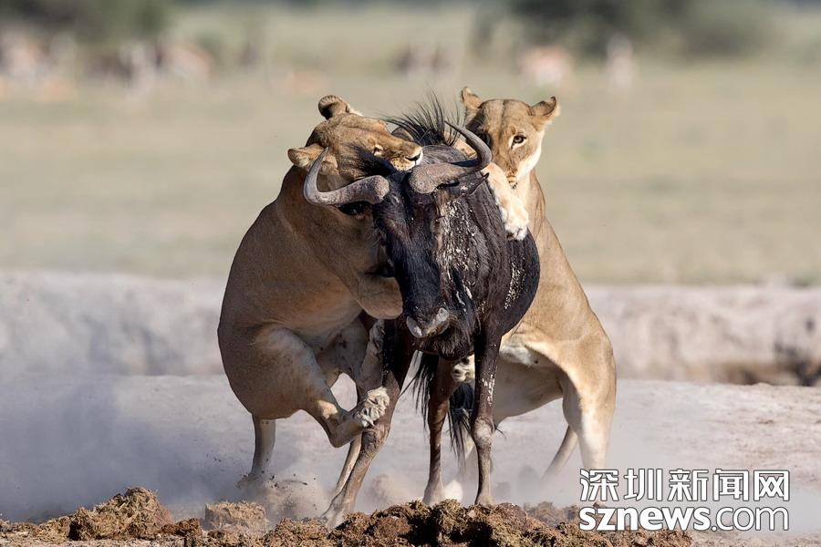英國(guó)攝影師蘇-莫里斯(Sue Morri)在博茨瓦納Nxai Pan國(guó)家公園游玩,目睹了一場(chǎng)兇惡母獅獵食角馬的畫(huà)面。母獅甚至攀到了角馬背上,想要牢牢遏制住到手的“美餐”。強(qiáng)壯的角馬努力地與母獅抗?fàn)?,竭力想要保住自己的性命,但最終還是不敵母獅被拿下,最后成了母獅孩子們的盤中餐。
