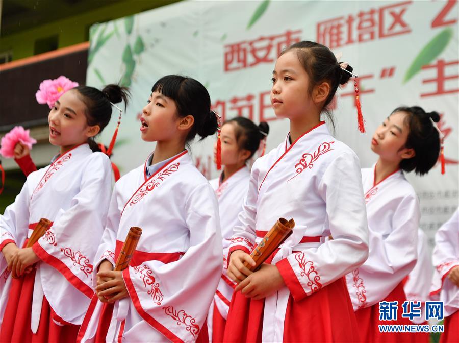 當日,陜西師范大學(xué)附屬小學(xué)在位于西安的校園里舉行傳統(tǒng)民俗活動迎接即將到來的端午節(jié)。