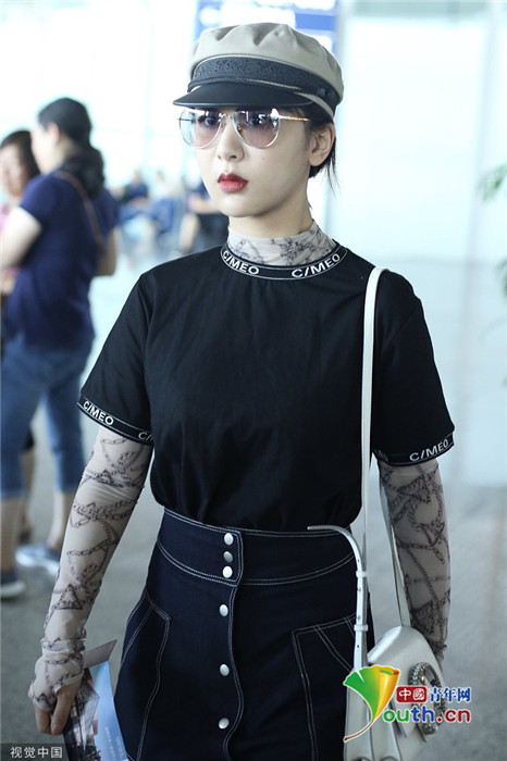 2019年7月25日,北京,楊紫現(xiàn)身機(jī)場。她穿黑色短T配牛仔裙變時(shí)髦女郎,戴報(bào)童帽架墨鏡”港風(fēng)女sir“即視感,人氣爆棚。