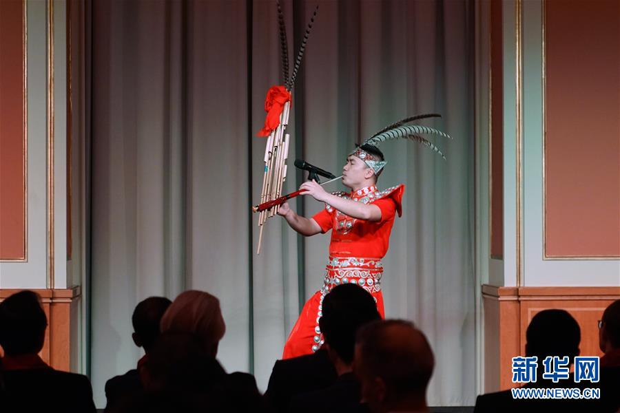 1月15日,在德國柏林,貴州省歌舞劇院藝術(shù)團的演員在晚會上吹奏蘆笙。 15日晚,2020年“歡樂春節(jié)”新春文藝晚會在德國柏林的紅色市政廳上演,中德兩國各界代表觀看演出,共慶中國農(nóng)歷新年。 新華社記者 王勍 攝
