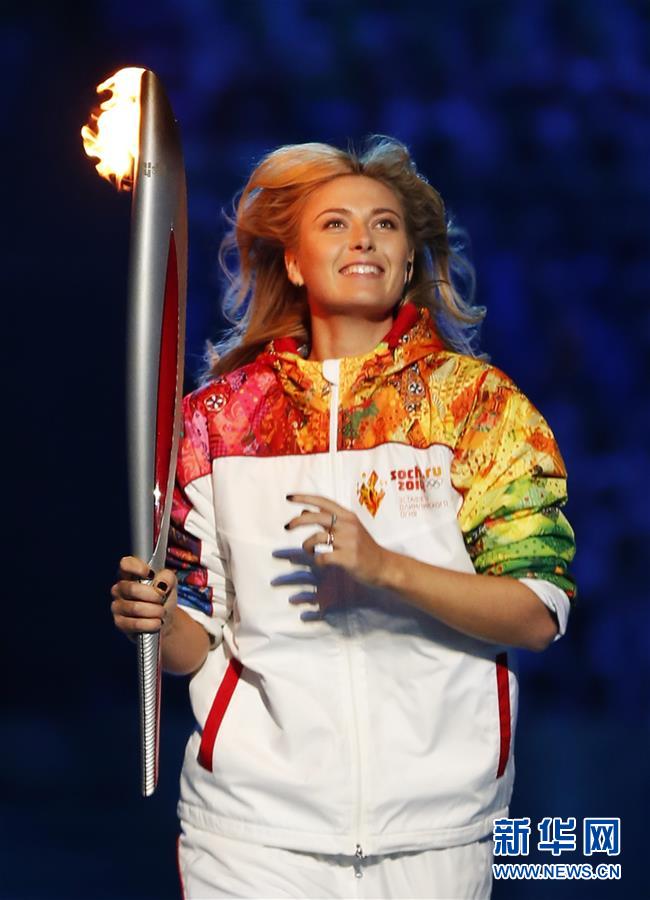 圖為2014年2月7日,莎拉波娃在索契冬奧會開幕式上手持火炬進行傳遞。 新華社記者王麗莉攝