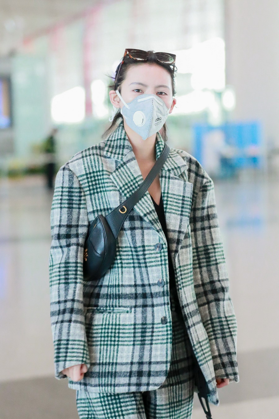 張予曦扎丸子頭穿格子西裝又美又颯 搭配斜挎小包潮范十足