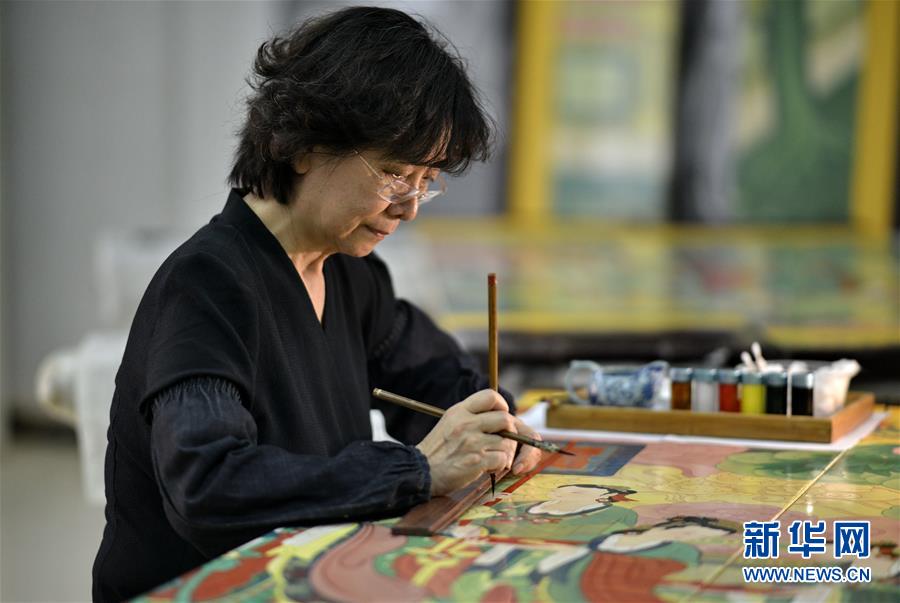 5月4日,工藝美術大師胡昕在進行屏風畫面最后的檢視修補。
