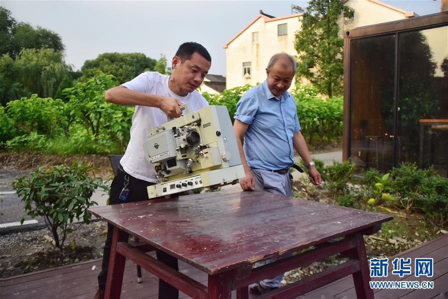 6月30日,朱生榮(右)和兒子朱強(左)在馬鳴村將軍湖廣場布置放映設備。