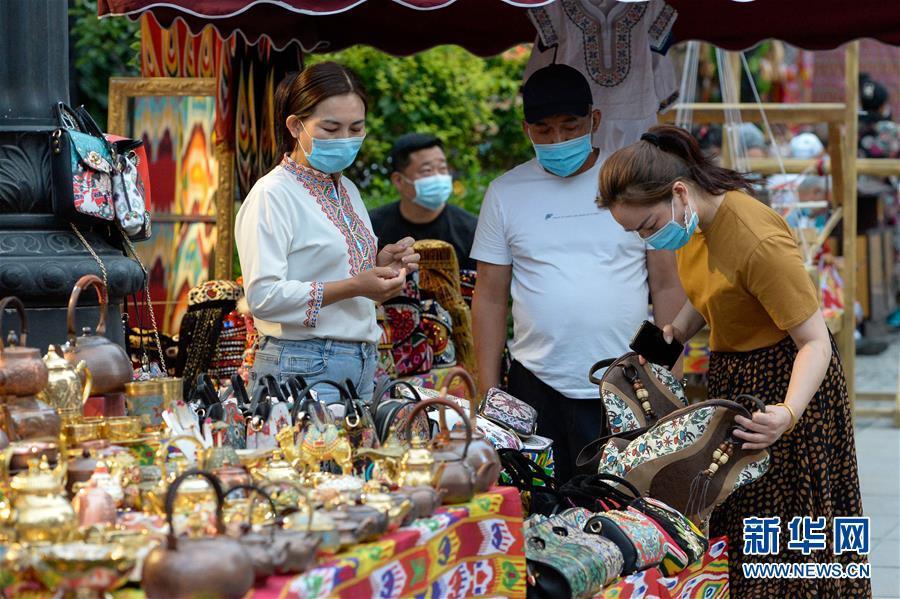 游客在烏魯木齊大巴扎景區(qū)選購商品(7月4日攝)。夏日周末,烏魯木齊市大巴扎景區(qū)內(nèi)熙熙攘攘,人們來到這里品嘗美食、休閑購物。2018年,經(jīng)過靚化改造后的大巴扎景區(qū)新增長(zhǎng)約800米的步行街,分為文創(chuàng)文旅和“非遺”項(xiàng)目街區(qū)、國際時(shí)尚街區(qū)和大巴扎美食街區(qū),是烏魯木齊最受歡迎的旅游目的地之一。新華社記者丁磊攝