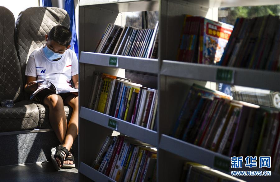 8月5日,一名小讀者在“流動(dòng)圖書館”里看書。三千冊(cè)圖書,一輛大巴車,穿梭在城市的街頭巷尾。在吉林長(zhǎng)春,長(zhǎng)春市圖書館利用流動(dòng)圖書車,定期在市內(nèi)15個(gè)固定服務(wù)點(diǎn)間巡回流動(dòng),為市民提供便捷的圖書借閱服務(wù)。新華社記者許暢攝