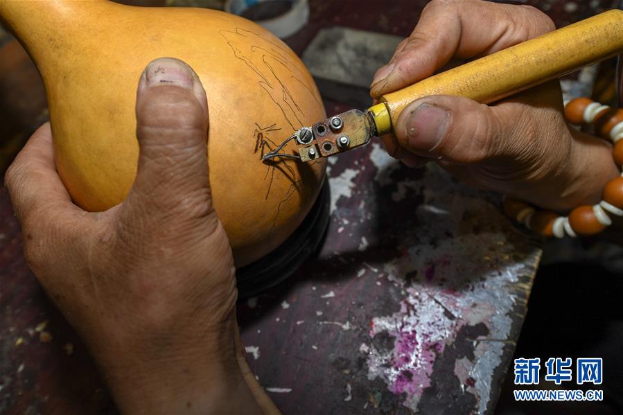 8月5日,侯景偉在葫蘆上進(jìn)行創(chuàng)作。今年55歲的吉林四平人侯景偉自幼與家人學(xué)習(xí)雕刻、烙畫藝術(shù)。經(jīng)過多年潛心研究,他將浮雕和烙畫工藝相結(jié)合,通過拋光、起稿、雕刻、烙燙、套色等十余道工藝,制作展現(xiàn)傳統(tǒng)文化、民俗故事的葫蘆工藝品。2020年,侯景偉被評(píng)為四平市非物質(zhì)文化遺產(chǎn)項(xiàng)目侯氏葫蘆雕刻烙畫代表性傳承人。他說:“希望有更多人加入到非遺傳承隊(duì)伍中,讓小葫蘆‘講’出更多民俗故事?!毙氯A社記者張楠攝