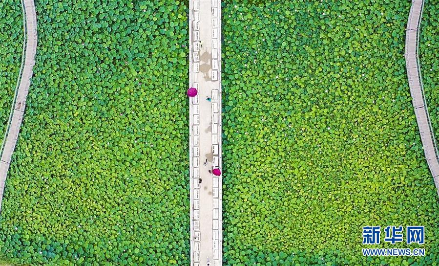 8月6日,游客在河北省永清縣里瀾城鎮(zhèn)金華湖觀賞荷花(無(wú)人機(jī)照片)。夏日時(shí)節(jié),河北省永清縣里瀾城鎮(zhèn)金華湖荷塘的荷花爭(zhēng)相開放,吸引市民和游客前來(lái)游玩觀賞。新華社記者李曉果攝