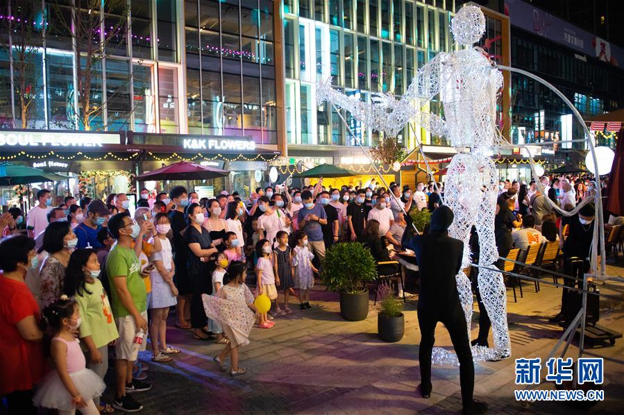 8月8日晚,市民在望京小街商業(yè)街觀看巨型人偶表演。當(dāng)日,作為北京消費(fèi)季活動(dòng)的一部分,北京市朝陽(yáng)區(qū)的“潮朝陽(yáng)”消費(fèi)季活動(dòng)正式重啟,位于朝陽(yáng)區(qū)的新興商業(yè)街望京小街舉辦開(kāi)街嘉年華活動(dòng)。新華社記者 陳鐘昊 攝