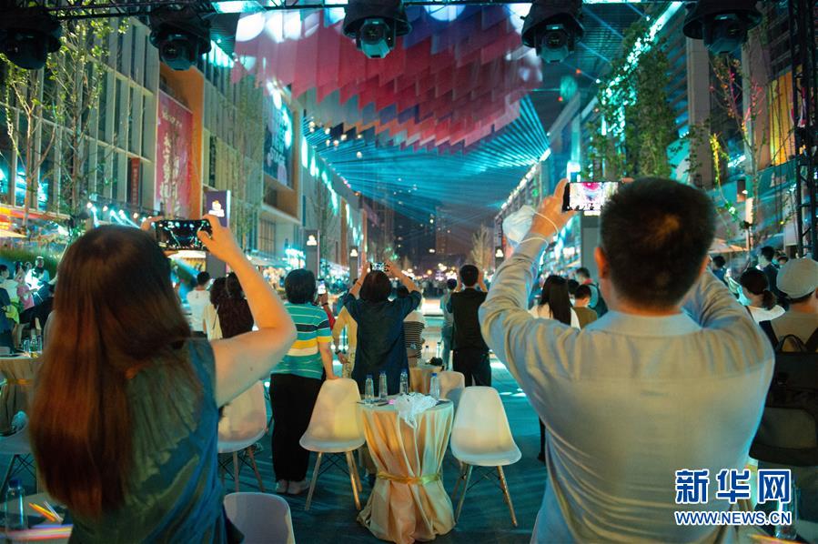 8月8日晚,市民在望京小街商業(yè)街觀看燈光秀。新華社記者 陳鐘昊 攝