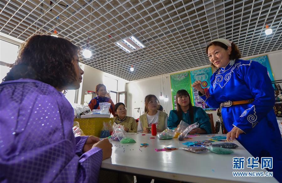 烏仁(右一)在內(nèi)蒙古自治區(qū)鄂溫克族自治旗巴彥托海鎮(zhèn)太陽(yáng)花傳承發(fā)展中心的制作車間與手工藝人交流(8月6日攝)。新華社記者徐欽攝。