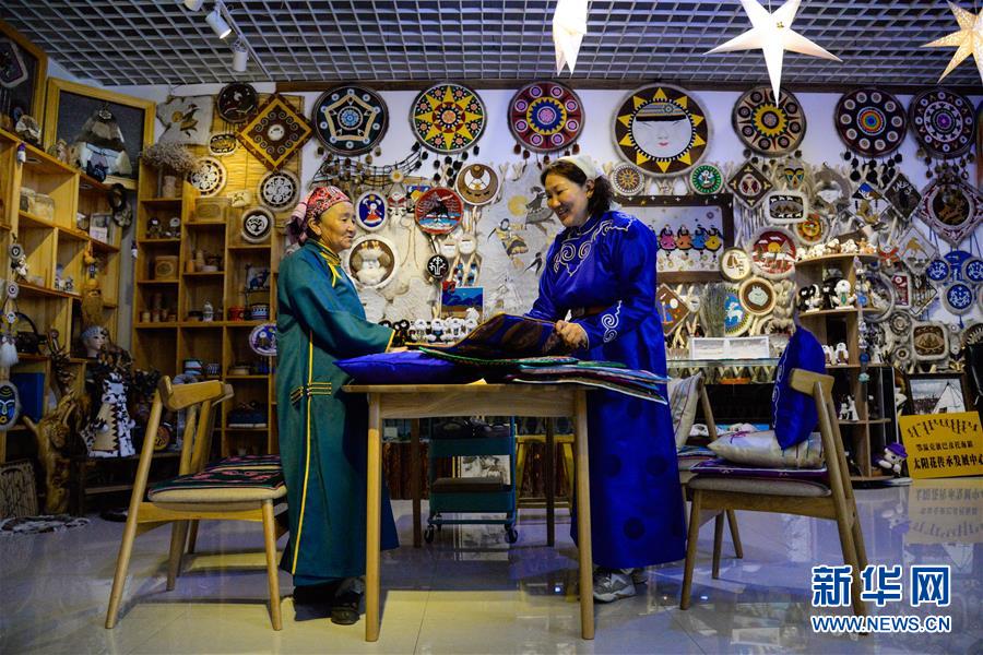 在內(nèi)蒙古自治區(qū)鄂溫克族自治旗巴彥托海鎮(zhèn)太陽花傳承發(fā)展中心,脫貧戶敖登圖雅(左)向烏仁交付自己制作好的手工藝品(8月6日攝)。新華社記者徐欽攝。